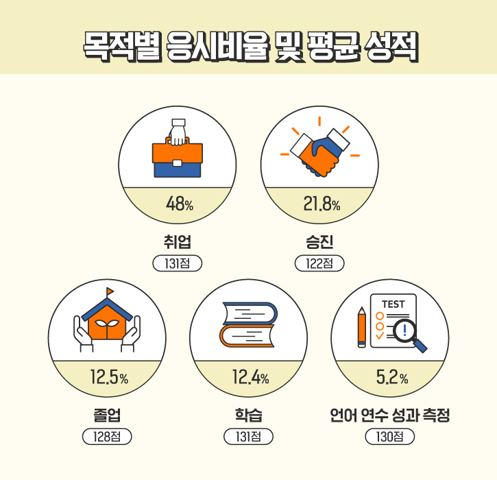 전 세계 토익스피킹 응시자들은 어떤 목적으로 시험에 응시했을까요? 분석 결과, ‘취업(48%)’이 3년 연속 높은 응답률을 기록하며, 1위를 차지했습니다. 실제로 올해 한국TOEIC위원회에서 실시한 ‘토익스피킹 관련 설문조사’에서도, 토익스피킹의 응시 목적을 묻는 질문에 ‘취업’이 45.9%로 가장 높은 응답률을 보였죠! 또, ‘취업’을 목표로 하는 응시자들의 평균 성적은 131점으로 ‘학습’과 함께 가장 높은 점수를 나타냈습니다. 뒤를 이어, ▲승진(21.8%) ▲졸업(12.5%) ▲학습(12.4%) ▲언어 연수 성과 측정(5.2%) 순으로 확인되었으며, 이전 연도와 비교해 ‘졸업’이 1.5% 상승한 수치를 보였습니다.