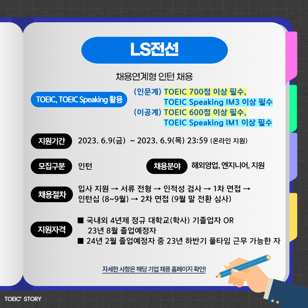 | LS전선 | 인턴 | 2023년 하반기 채용연계형 인턴 채용 | 6.29(목) 24:00 | 인문계: TOEIC 700점 이상 필수, TOEIC Speaking IM3 이상 필수 이공계: TOEIC 600점 이상 필수, TOEIC Speaking IM1 이상 필수 |