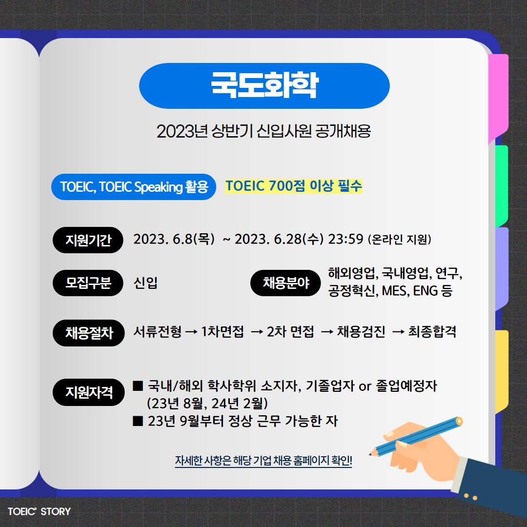 | 국도화학 | 신입 | 2023년 상반기 신입사원 공개채용 | 6.28(수) 23:59 | TOEIC 700점 이상 필수 |