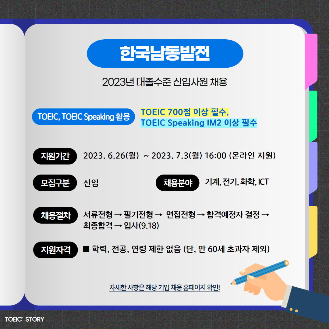 | 한국남동발전 | 신입 | 2023년 대졸수준 신입사원 채용 | 7.3(월) 16:00 | TOEIC 700점 이상 필수, TOEIC Speaking IM2 이상 필수 |