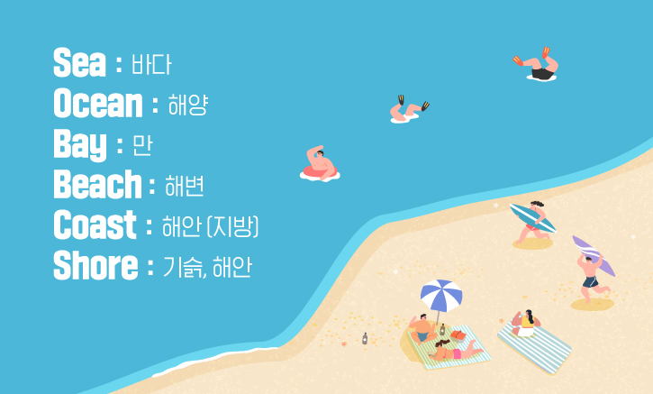 더불어, 바다와 관련된 다른 영어 표현도 살펴보겠습니다. 먼저 ‘Bay’는 만(바다가 육지 쪽으로 들어와 있는 형태의 지형)을 뜻하는 단어인데요! ‘Sickbay(의무실, 양호실)’처럼 구역, 구간의 뜻도 있다는 점도 함께 알아두면 좋겠죠? ‘Beach’는 모래나 작은 돌들이 있는 바닷가를 말합니다. 모래가 퇴적되어 형성된 곳은 ‘Sand beach(사빈)’, 자갈이 퇴적되어 형성된 곳은 ‘Gravel beach(자갈해빈)’라고 합니다. 또, ‘Coast’와 ‘Shore’는 모두 해안을 뜻하는 단어인데요. ‘Shore’는 더 넓은 의미로 바다·호수와 같은 해안을 의미하고, ‘Coast’는 해안과 그 인근의 땅까지 포함합니다. :)