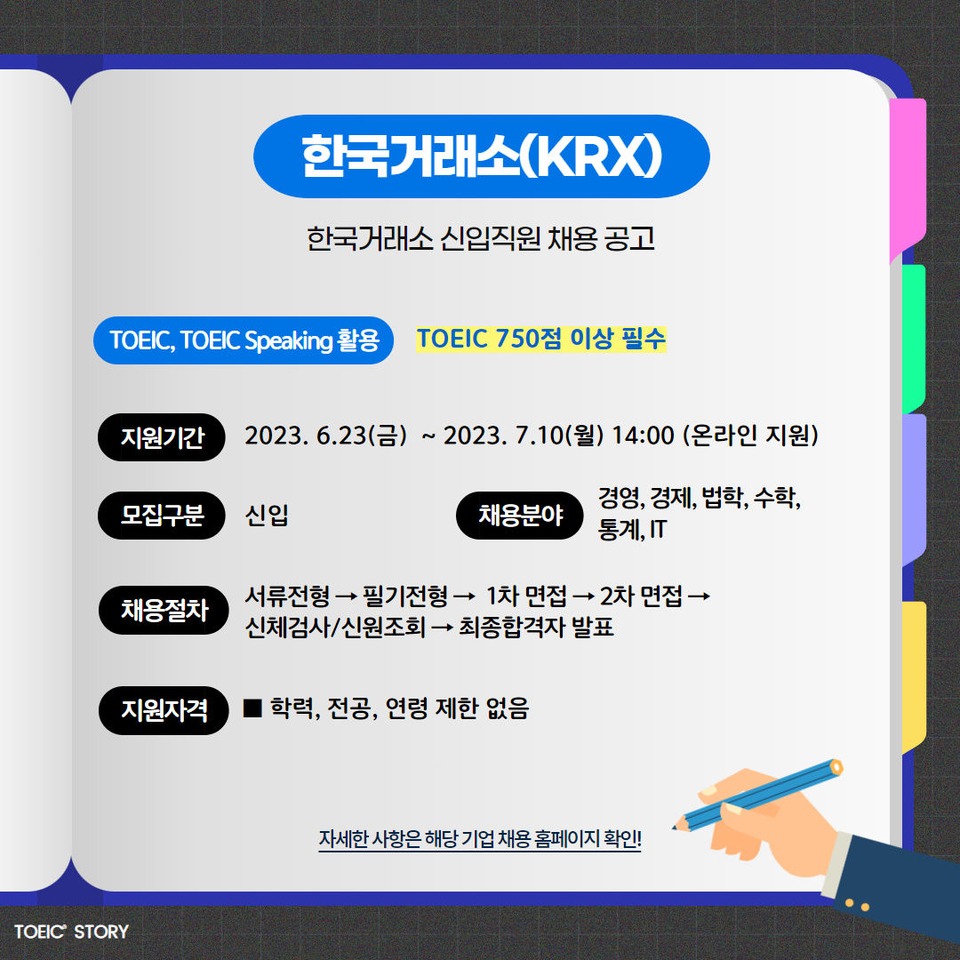 | 한국거래소 | 신입 | 한국거새로 신입직원 채용 공고 | 7.10(월) 14:00 | TOEIC 750점 이상 필수 |