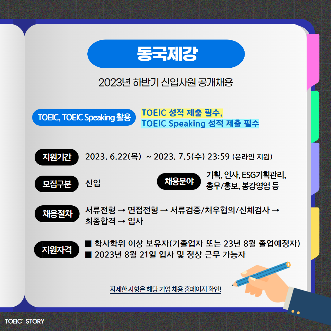 | 동국제강 | 신입 | 2023년 하반기 신입사원 공개채용 | 7.5(수) 23:59 | TOEIC 성적 제출 필수, TOEIC Speaking 성적 제출 필수 |