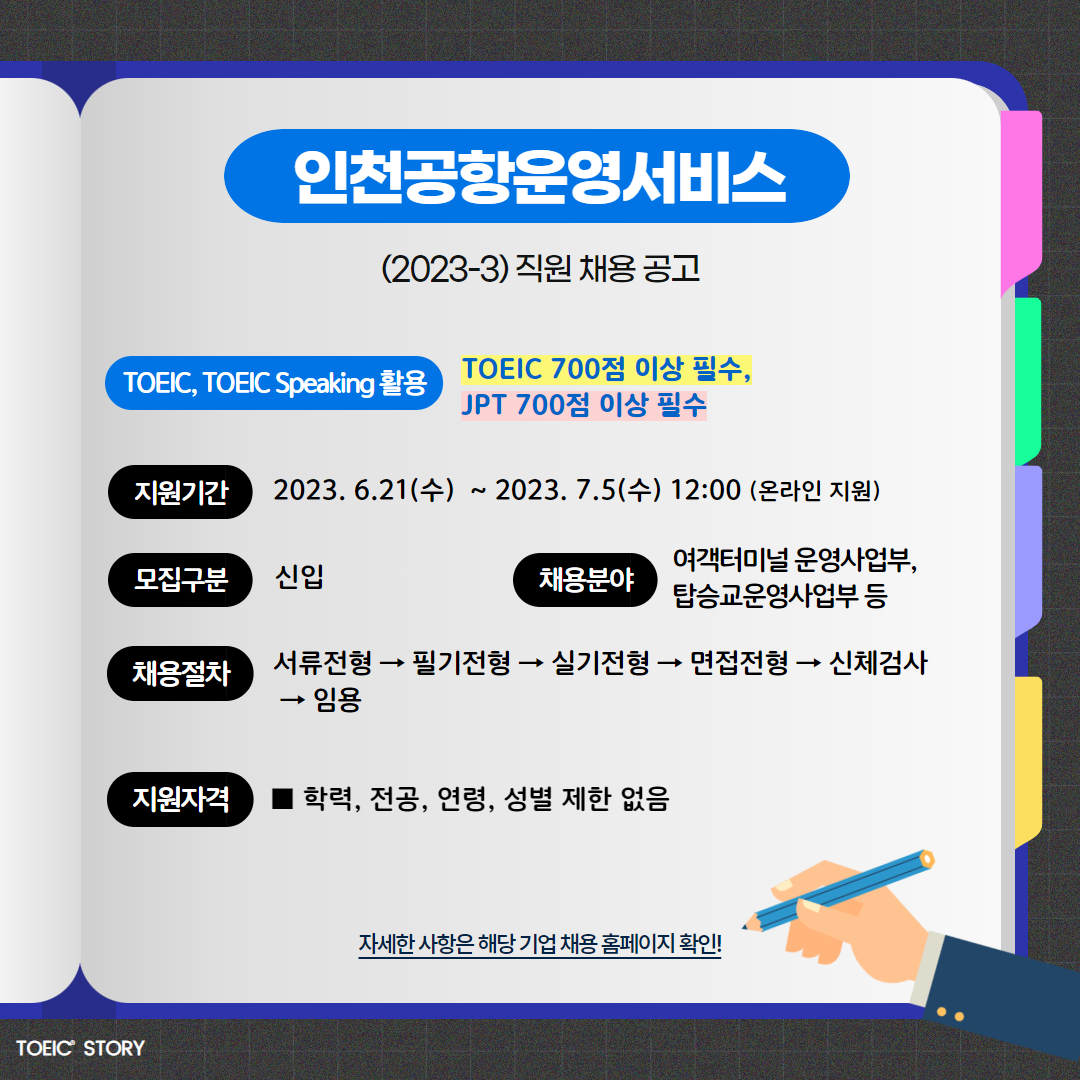 | 인천공항운영서비스 | 신입 | (2023-3) 직원 채용 공고 | 7.5(수) 12:00 | TOEIC 700점 이상 필수, JPT 700점 이상 필수 |