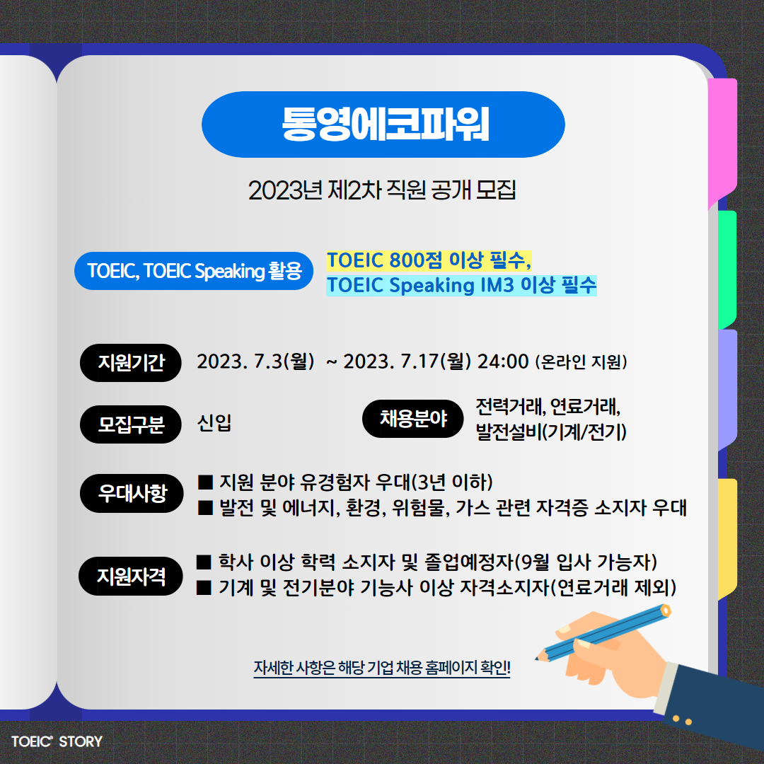통영에코파워 신입 2023년 제2차 직원 공개 모집 7.17(월) 24:00 TOEIC 700점 이상 필수,