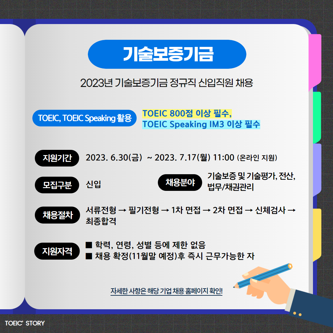 또한, '기술보증 및 기술평가' 직무의 일반, 이공계, 보훈 및 '법무/채권관리' 직무의 일반 지원자는 토익 800점 이상 또는 토익스피킹 IM3 이상의 성적을 반드시 제출해야 합니다!