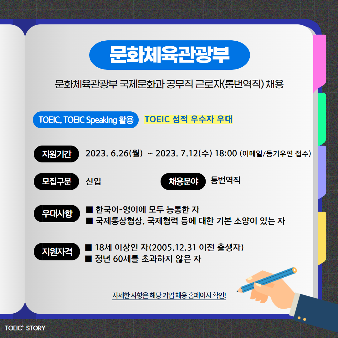 | 문화체육관광부 | 신입 | 문화체육관광부 국제문화과 공무직 근로자(통번역직) 채용 | 7.12(수) 18:00 | TOEIC 성적 우수자 우대 |