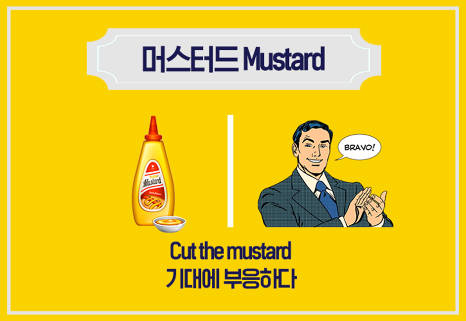 또한 머스터드가 가진 톡 쏘는 맛은 인간의 열정과 에너지를 뜻하고, 이 표현에서 ‘Cut’은 ‘드러내다’라고 해석되는데요. 따라서, ‘Cut the mustard’는 열정과 에너지를 드러내는, 그리고 열정과 에너지를 다해 ‘기대에 부응하다’라는 의미로 발전되었다고 하네요. :)