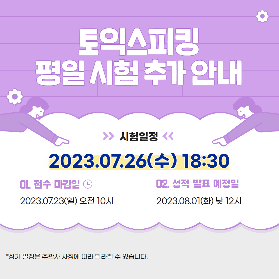 추가 시행되는 평일 시험은 2023년 7월 26일(수) 오후 6시 30분에 진행됩니다.