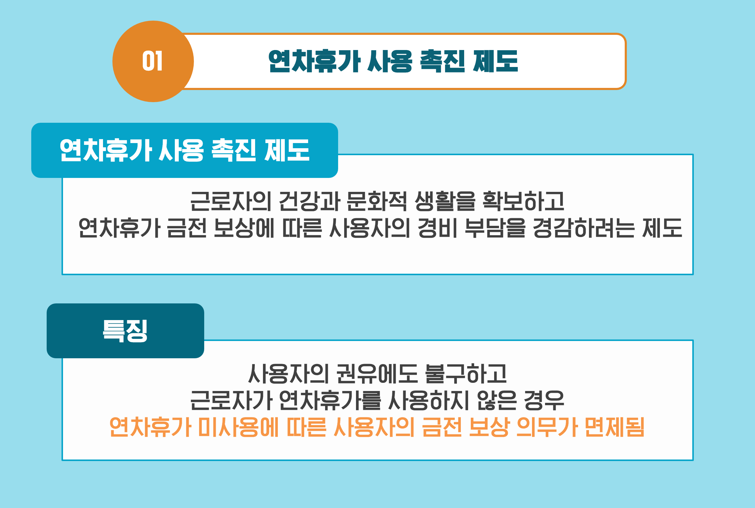 A1. 연차휴가 사용 촉진 제도란 기존의 잘못된 연차휴가 사용 관행을 개선하여 근로자의 건강과 문화적 생활을 확보하고 연차휴가 금전 보상에 따른 사용자의 경비 부담을 경감하려는 제도입니다.
