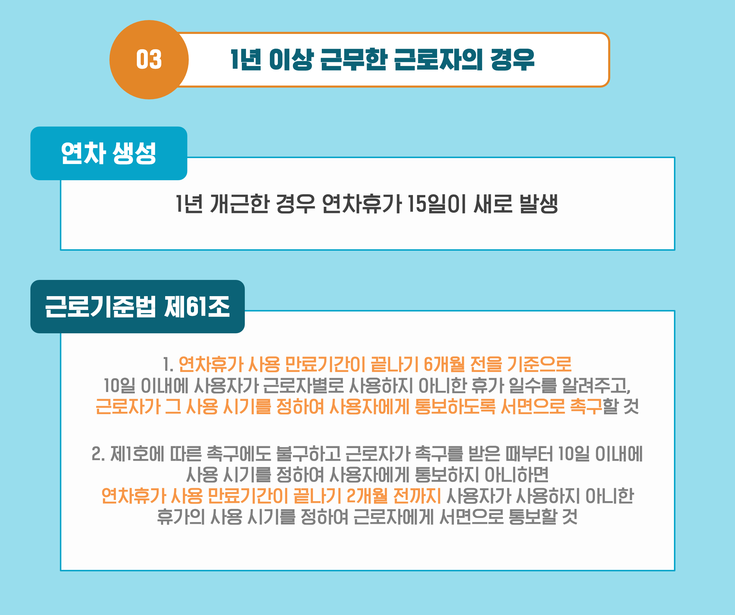 1년 이상 일한 근무자의 연차휴가 사용 촉진 방법은 1∙2차로 나뉘어지며, 아래의 내용과 같습니다.
