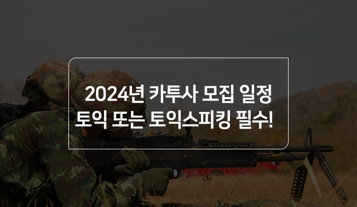 2024년도 예비 카투사들 여기 모여라! 2024년도 입영대상 카투사 모집이 안내되었습니다. 병무청 홈페이지에 접속하시면 공지를 확인하실 수 있는데요. 카투사(KATUSA)는 미군에 배속된 한국 병사인 만큼, 지원 자격 중 공인 영어 성적 제출이 있습니다.