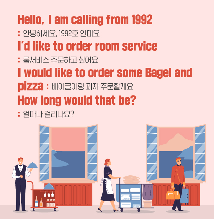 호텔에서 룸서비스를 주문하고 싶다면, 이 표현들을 활용해 보세요! 주문 전, 객실 번호를 얘기할 때는 ‘Hello, I am calling from 1992(안녕하세요, 1992호인데요)’라고 얘기하면 됩니다. 이후 ‘I’d like to order room service’라고 룸서비스를 주문하겠다는 의사를 전달하면 되죠!
