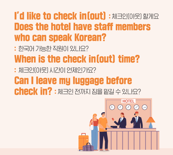 호텔에 도착했다면 재빠른 체크인은 필수죠! 체크인을 원한다면, 프런트 직원에게 ‘I’d like to check in’이라고 말해 보세요. 투숙 후 체크아웃을 할 때도 ‘I’d like to check out’이라고 활용해 볼 수 있습니다. 또, 외국의 호텔에서 한국말을 할 줄 아는 직원이 필요하다면 ‘Does the hotel have staff members who can speak Korean?(한국어 가능한 직원이 있나요?)’이라고 물으면 됩니다.