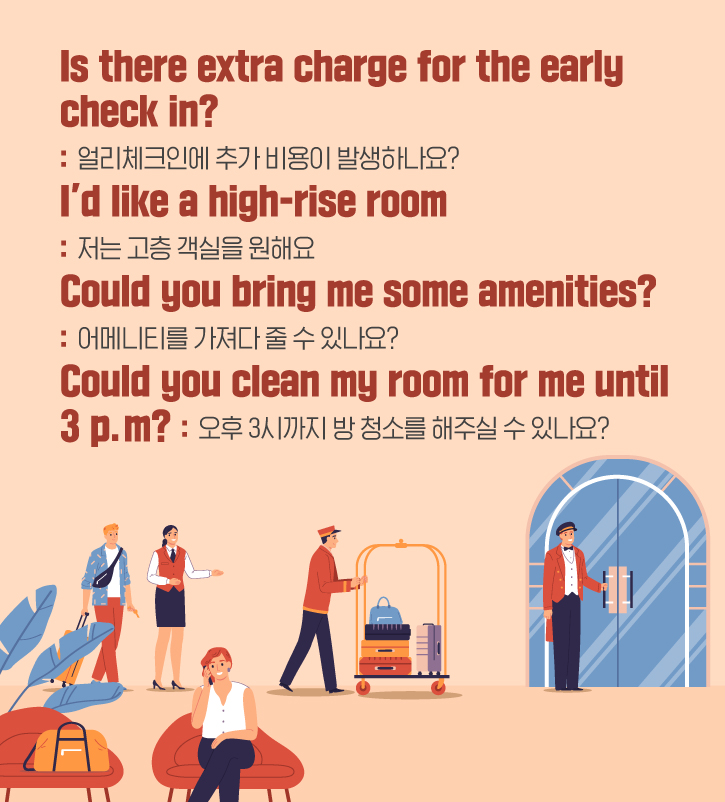 다음은 호텔에서 자주 사용하는 요청사항에 대해 살펴보겠습니다. 체크인 시간보다 일찍 도착해 기존 시간보다 빨리 체크인하는 것을 ‘Early check in’이라고 하죠. ‘Early check in’을 하기 위해서는 추가 비용을 지불해야 할 때가 있는데요. 금액이 궁금하다면, ‘Is there extra charge for the early check in?’이라고 물어볼 수 있습니다. 또, 전망 좋은 고층 객실을 원한다면 ‘I’d like a high-rise room’이라고 요청해 보세요! ‘High rise’는 ‘high’(부사)와 ‘rise’(동사)의 결합으로 만들어진 단어로, 고층 건물을 의미한답니다.