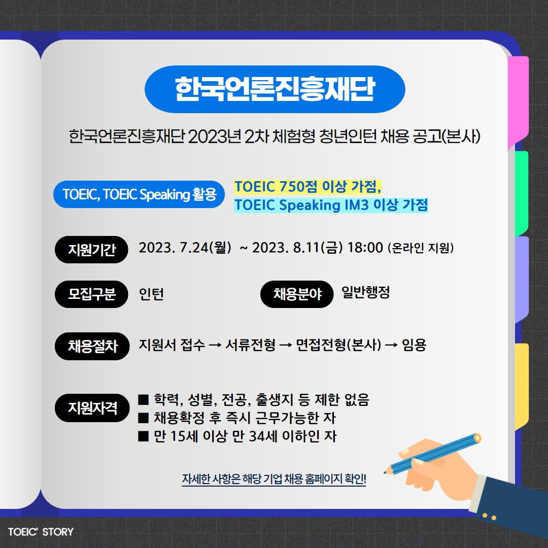 | 한국언론진흥재단 | 인턴 | 한국언론진흥재단 2023년 2차 체험형 청년인턴 채용 공고(본사) | 8.11(금) 18:00 | TOEIC 750점 이상 가점, TOEIC Speaking IM3 이상 가점 |
