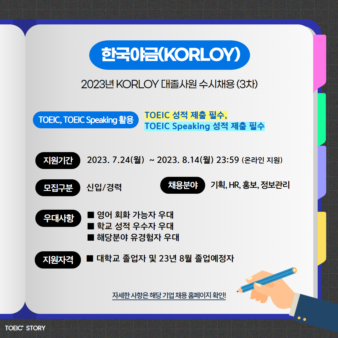 | 한국야금(KORLOY) | 신입 | 2023년 KORLOY 대졸사원 수시채용 | 8.14(월) 23:59 | TOEIC 성적 제출 필수, TOEIC Speaking 성적 제출 필수 |