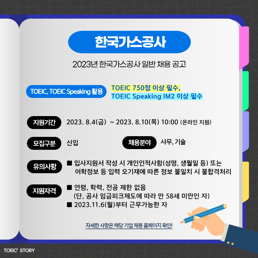 | 한국가스공사 | 신입 | 2023년 한국가스공사 일반 채용공고 | 8.10(목) 10:00 | TOEIC 750점 이상 필수, TOEIC Speaking IM2 이상 필수 |