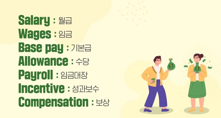 직장인이라면 빼놓을 수 없는 관심사, 월급과 관련된 표현에는 무엇이 있을까요? 월급은 영어로 ‘Salary’라고 합니다. 이는 월 또는 연단위로 지급되는 고정된 급여를 의미하죠. 반대로, ‘Wages(임금)’는 시간 당 또는 근무한 시간에 대한 급여를 의미하는데요. 주로 아르바이트나 임시직 등에서 일하며 시간 당 유동적인 급여를 받는 노동자들을 대상으로 합니다.