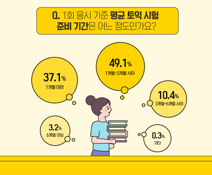 토익 1회 응시를 기준으로, 평균 준비 기간은 어느 정도인지 묻는 질문에는 ‘1개월~3개월 사이’가 49.1%로 가장 높은 응답률을 보였습니다. 뒤이어, ‘1개월 미만(37.1%)’, ‘3개월~6개월 사이(10.4%)’, ‘6개월 이상(3.2%)’, ‘기타(0.3%)’ 순으로 나타났습니다.