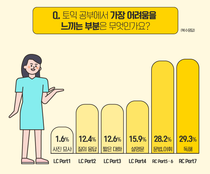 그렇다면 토익 응시자들이 문제를 풀 때 가장 어려움을 느끼는 부분은 어디일까요? 설문 결과에 따르면, 주로 LC 보다 RC에서 어려움을 겪고 있는 것으로 나타났습니다.