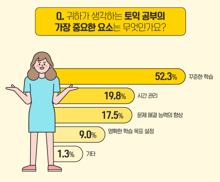 그렇다면 토익 응시자들이 생각하는 토익 공부의 가장 중요한 요소는 무엇일까요? 응답자 10명 중 5명은 ‘꾸준한 학습(52.3%)’을 꼽았습니다. 뒤이어 ‘시간 관리(19.8%)’, ‘문제 해결 능력의 향상(17.5%)’, ‘명확한 학습 목표 설정(9.0%)’, ‘기타(1.3%)’ 순으로 나타났습니다.