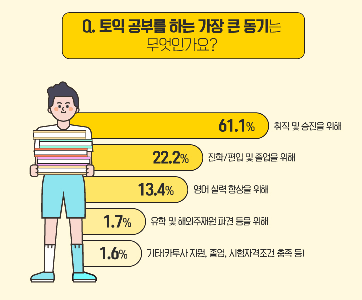 다음으로 토익 응시자들이 토익 공부를 하는 가장 큰 동기는 무엇일까요? 10명 중 6명의 응답자가 ‘취직 및 승진을 위해(61.1%)’라고 답했습니다. 이는 토익이 취직 및 승진에 막대한 영향을 미치고 있는 것으로 파악해 볼 수 있는데요. 실제로, 지난 5월에 시행된 <‘취업’과 ‘토익’에 대한 여러분의 생각은?> 설문조사에서 48.8%의 응답자(대학생/대학원생, 취업준비생, 기타 응답자 대상)가 ‘취업에 있어서 토익은 필수 스펙’이라고 생각했죠.
