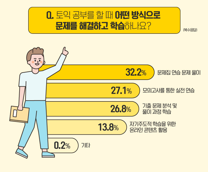 <토익스토리> 가족들은 토익을 공부할 때, 어떤 방식으로 문제를 해결하고 학습할까요? ‘문제집을 통한 연습 문제 풀이’가 32.1%로 1위를 차지했습니다. 이어 ‘모의고사를 통한 실전 연습’이 27.1%, ‘기출 문제 분석 및 풀이 과정 학습’이 26.8%로, 근소한 차이로 뒤따랐습니다. 다음은 ‘자기주도적 학습을 위한 온라인 콘텐츠 활용(13.8%)’, ‘기타(0.2%)’가 뒤를 이었습니다!