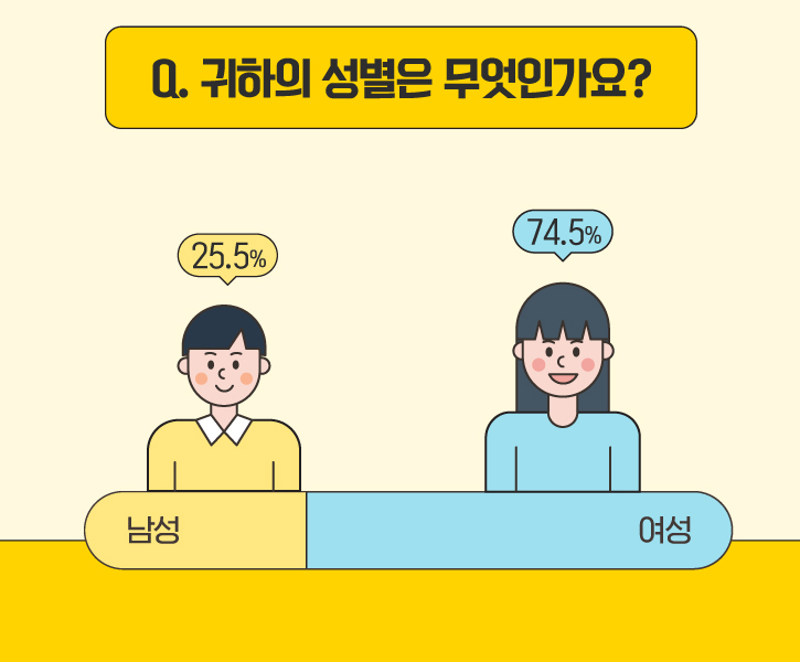 설문 응답자의 성비는 ‘여성’이 74.5%, ‘남성’이 25.5%로 여성 응답자가 더 높은 수치를 보였네요!