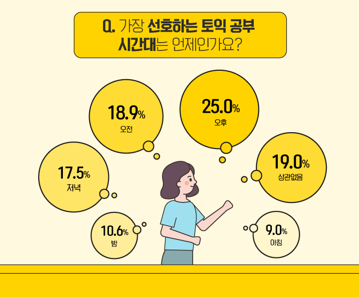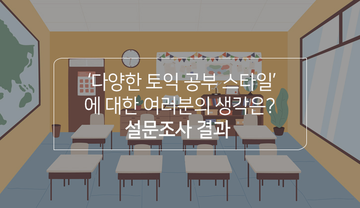 지금까지 ‘다양한 토익 공부 스타일’에 대한 설문조사 결과를 살펴보았는데요. 이번 콘텐츠를 통해 다양한 토익 공부 스타일에 대해 알아보고, 토익 꿀팁도 얻어 가는 시간이 되었길 바랍니다! <토익스토리> 가족 여러분의 성공적인 토익 공부를 응원하며, 오늘은 여기서 이만 인사드리겠습니다. 우리 다음 시간에 만나요! :)
