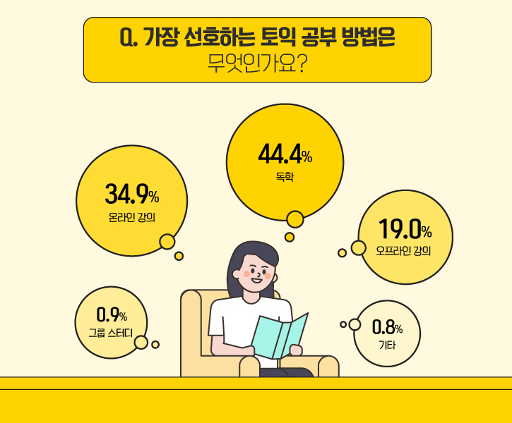 모든 공부를 시작하는 데 있어 자신과 맞는 학습 방법을 찾는 것은 매우 중요한 일입니다. 이에, <토익스토리>에서는 지난 7월 19일부터 8월 9일까지 ‘다양한 토익 공부 스타일’에 대한 <토익스토리> 가족 여러분의 생각을 들어봤는데요. 지금부터 그 결과를 토익포그래픽으로 함께 살펴볼까요? :)