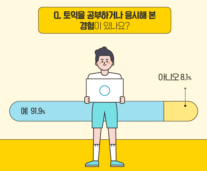 첫 질문으로, 토익 공부나 응시 경험에 대한 여부를 물었는데요. ‘토익을 공부하거나 응시해 본 경험이 있다’고 답한 응답자가 91.9%로, 응답자 10명 중 9명은 토익 공부∙응시 경험이 있는 것으로 확인되었습니다.