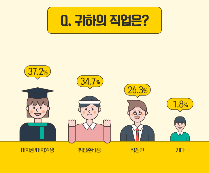 이번 설문 응답자 중 가장 많은 비율을 차지한 직업은 ‘대학생/대학원생(37.2%)’이었습니다. ‘취업준비생(34.7%)’이 근소한 차이로 그 뒤를 이었고, ‘직장인(26.3%)’, ‘기타(1.8%)’ 순으로 집계되었습니다.