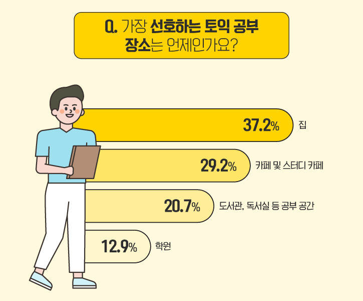 공부 장소는 개인의 학습 경험을 최적화하고 효율적인 학습에 영향을 주는, 무시할 수 없는 요소 중 하나인데요. 가장 선호하는 토익 공부 장소는 어디인지 물은 결과, ‘집’을 선호하는 응답자가 37.2%로 가장 많았습니다.