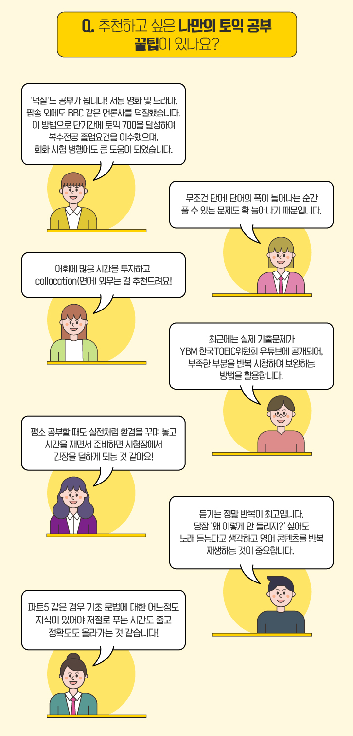 마지막으로, 설문 응답자에게 토익 공부 꿀팁에 대해 물었는데요. 덕질, 단어 및 연어 외우기 등 많은 꿀팁이 전해졌습니다. <토익스토리> 가족 여러분들도 위 토익포그래픽을 통해 다른 응시자분들의 토익 꿀팁을 살펴보세요!