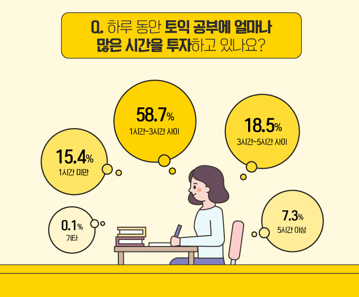 그렇다면 토익 응시생들은 하루 동안 토익 공부에 얼마나 많은 시간을 투자하고 있을까요? ‘1시간~3시간 사이’가 58.7%로 전체 응답의 절반 이상을 차지했습니다. 이어, ‘3시간~5시간 사이(18.5%)’, ‘1시간 미만(15.4%)’, ‘5시간 이상(7.3%)’, ‘기타(0.1%)’ 순으로 확인됐습니다.