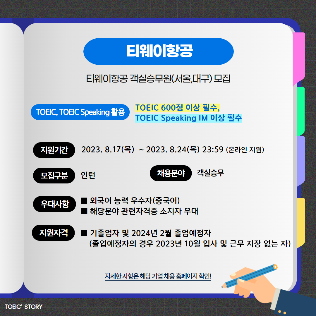 | 티웨이항공 | 인턴 | 티웨이항공 객실승무원 모집(서울, 대구) | 8.24(목) 23:59 | TOEIC 600점 이상 필수, TOEIC Speaking IM 이상 필수 |