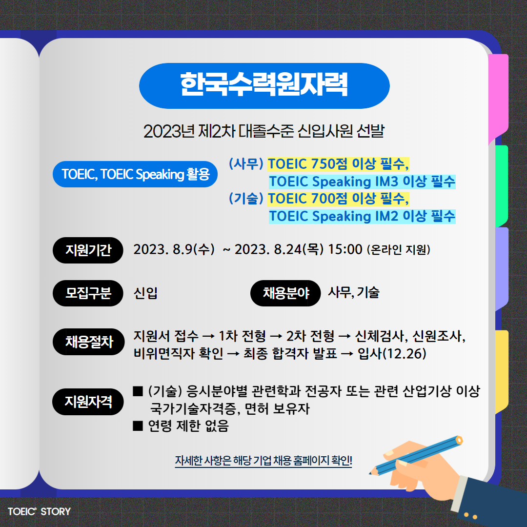 | 한국수력원자력 | 신입 | 2023년 제2차 대졸수준 신입사원 선발 | 8.24(목) 15:00 | 사무: TOEIC 750점 이상 필수, TOEIC Speaking IM3 이상 필수 기술: TOEIC 700점 이상 필수, TOEIC Speaking IM2 이상 필수 |