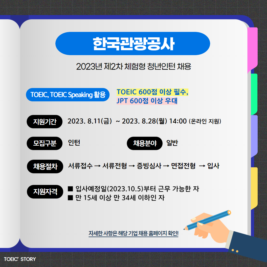 | 한국관광공사 | 인턴 | 2023년 제2차 체험형 청년인턴 채용공고 | 8.28(월) 14:00 | TOEIC 600점 이상 필수, JPT 600점 이상 우대 |