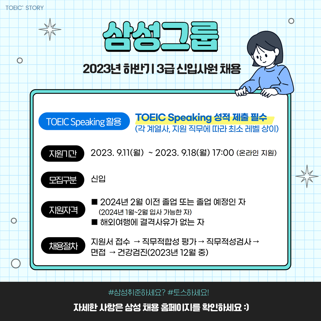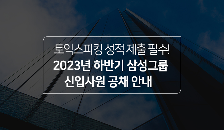 지금까지 2023년 하반기 삼성그룹 공채 소식을 전해드렸습니다. :) 여러분의 합격을 위해 토익스피킹은 평일 시험 추가를 통해 힘차게 응원하고 있습니다. 응원의 기운을 모두 받아, 합격의 기쁨을 누리시길 바랍니다!