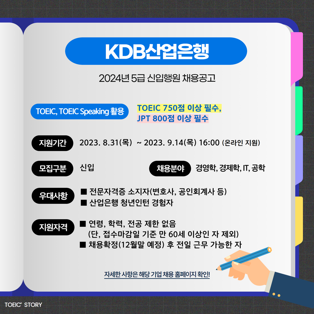 | KDB산업은행 | 신입 | 2024년 5급 신입행원 채용공고 | 9.14(목) 16:00 | TOEIC 750점 이상 필수, JPT 800점 이상 필수 |