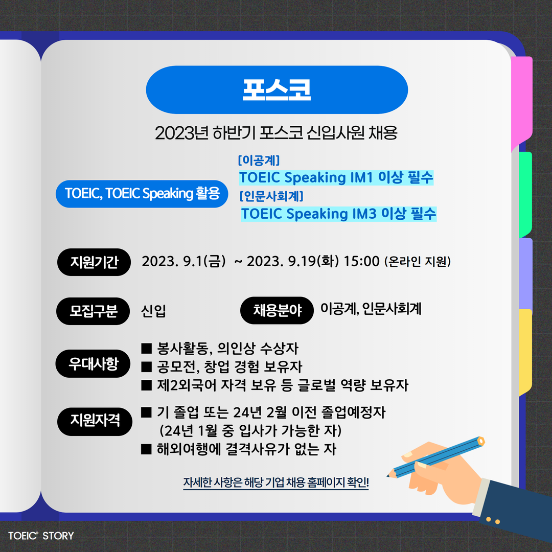 2023년 하반기 포스코그룹에서는 해당 채용이 진행됩니다. 계열사명 및 필요한 토익스피킹 성적을 확인하세요!