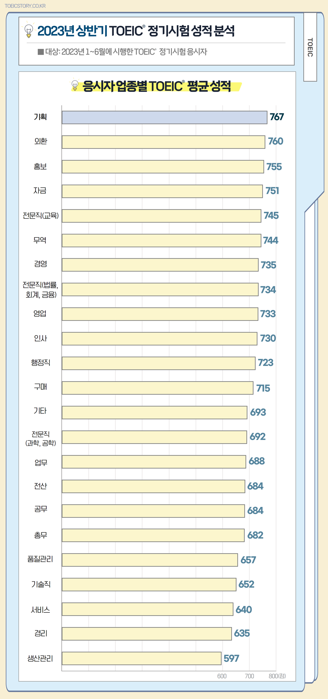 마지막으로 응시자 업종별 토익 평균 성적을 살펴보겠습니다. 기획 업종 수험자 평균 성적이 767점으로 가장 높았는데요! 2022년 정기시험에서 '기획' 업종은 평균 755점으로 응시자 업종별 평균 2위를 기록했던 바 있습니다. 2023년 상반기에는 2022년 평균 1위였던 '외환' 업종을 제치고 1위를 달성한 것이 눈에 띄네요.