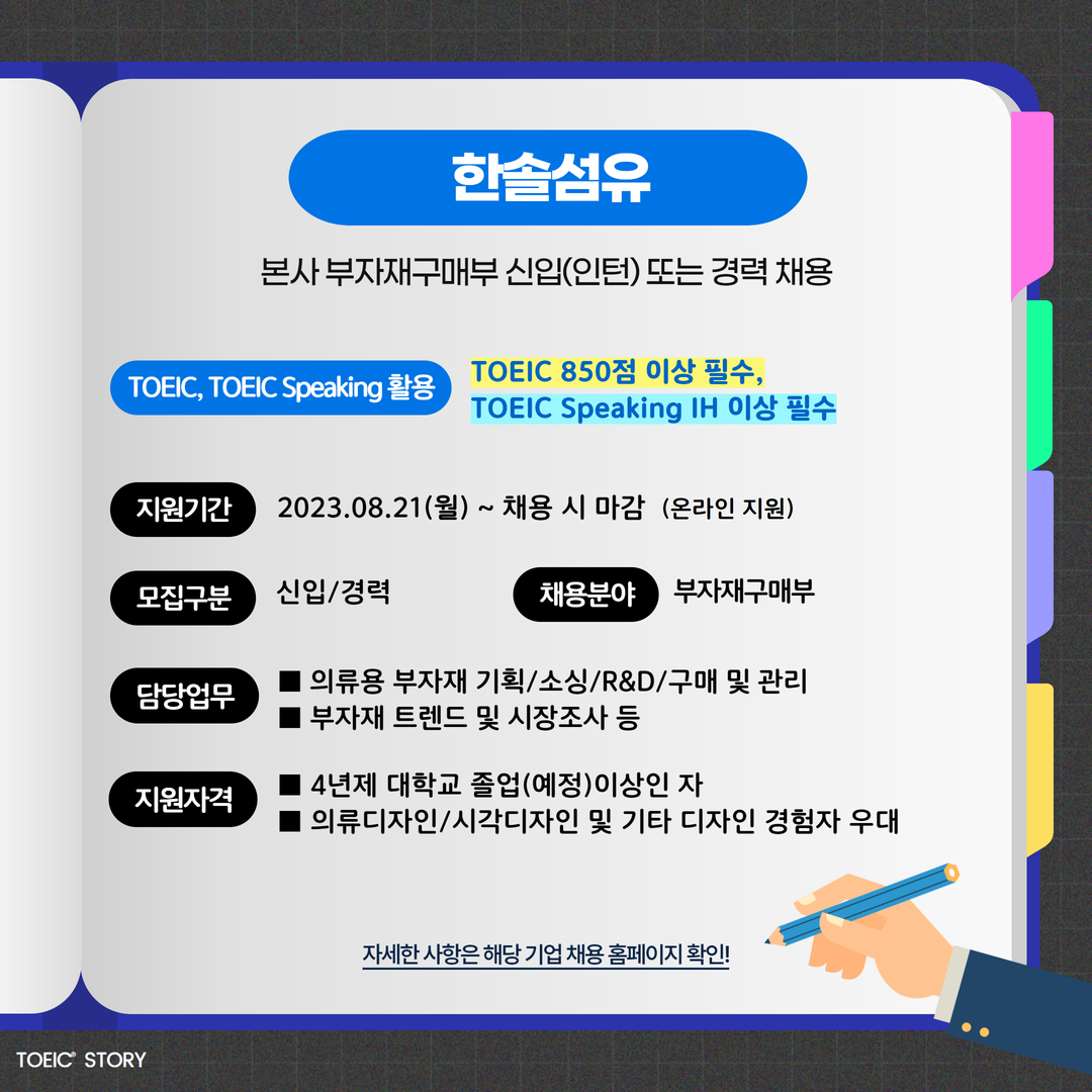 | 한솔섬유 | 신입/경력 | 한솔섬유 본사 부자재구매부 신입 또는 경력 채용 | 채용 시 마감 | TOEIC 850점 이상 필수, TOEIC Speaking IH 이상 필수 |