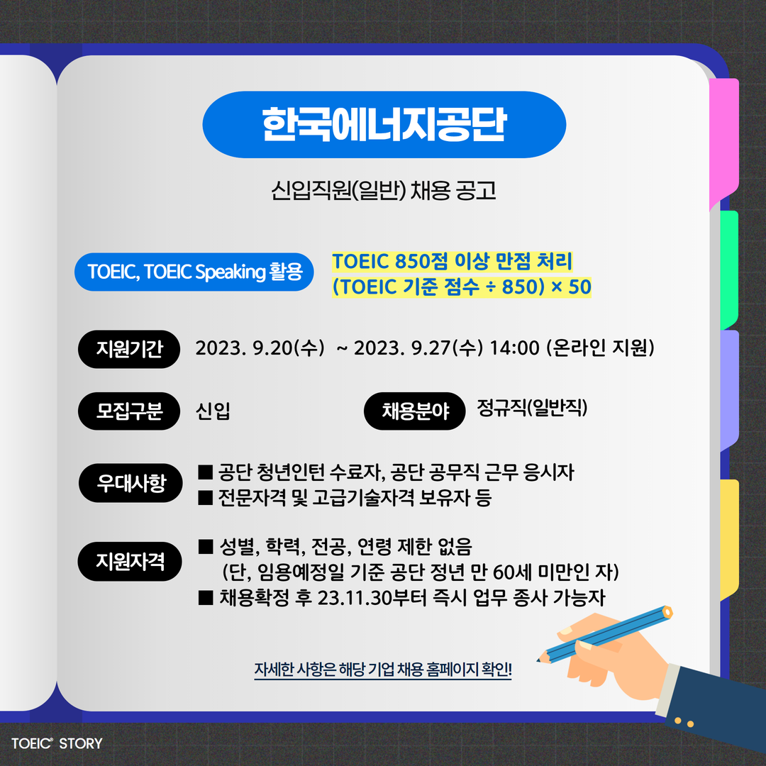 | 한국에너지공단 | 신입 | 한국에너지공단 신입직원(일반) 채용 공고 | 9.27(수) 14:00 | TOEIC 850점 이상 만점 처리 적용 |