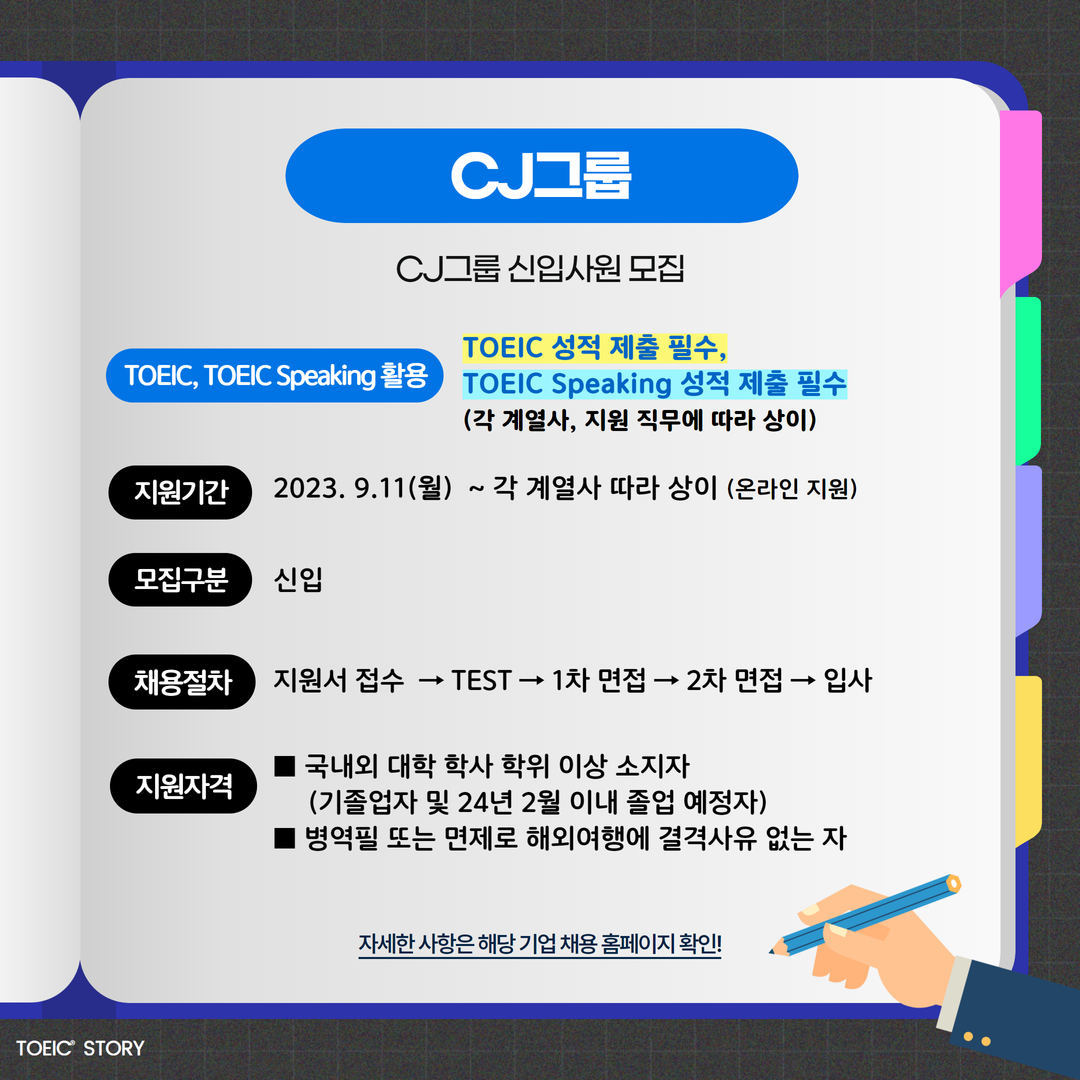 | CJ그룹 | 신입 | CJ그룹 신입사원 모집 | 각 계열사 따라 상이 | TOEIC 성적 제출 필수, TOEIC Speaking 성적 제출 필수 (각 계열사, 직무에 따라 상이) |
