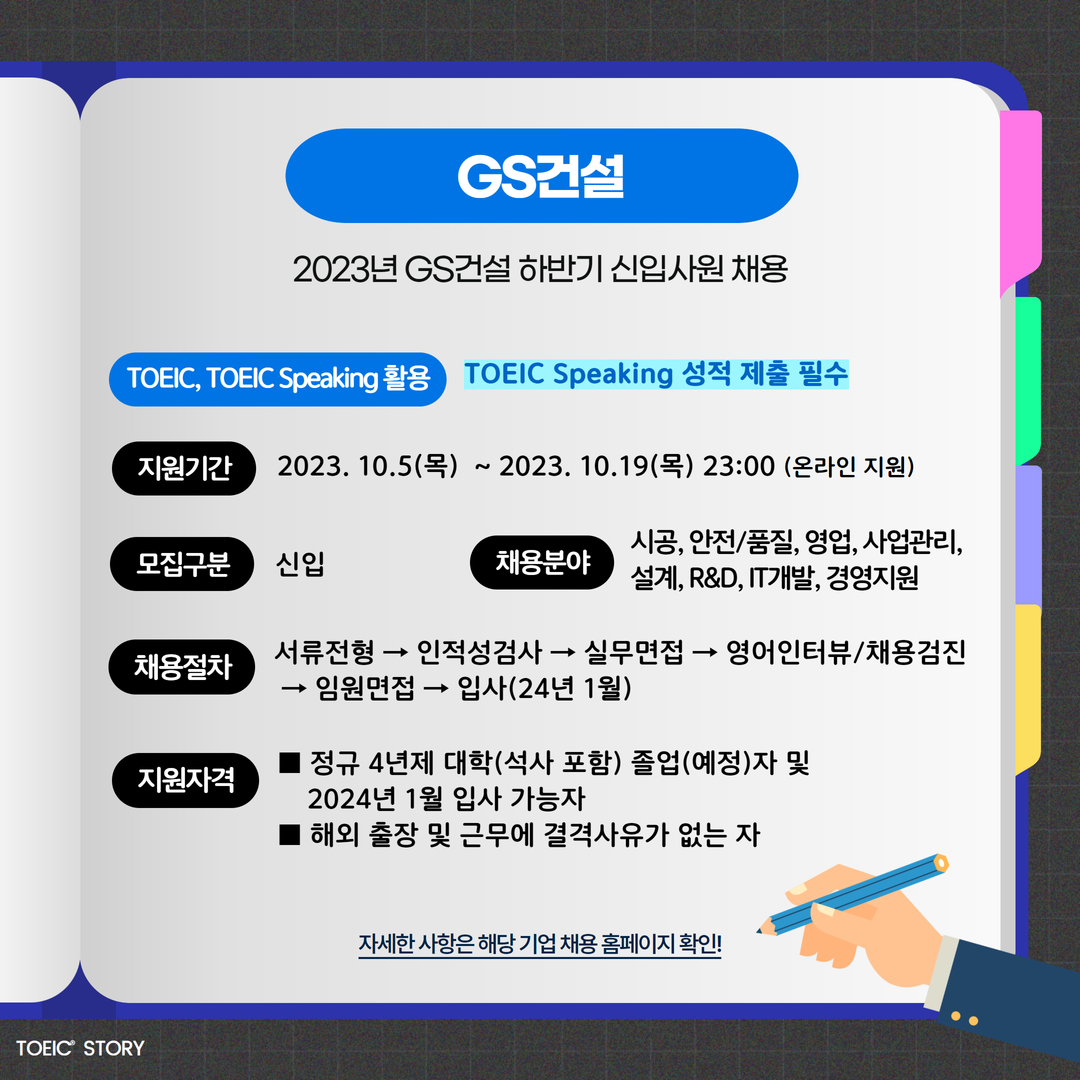 | GS건설 | 신입 | 2023년 GS건설 하반기 신입사원 채용 | 10.19(목) 23:00 | TOEIC Speaking 성적 제출 필수 |