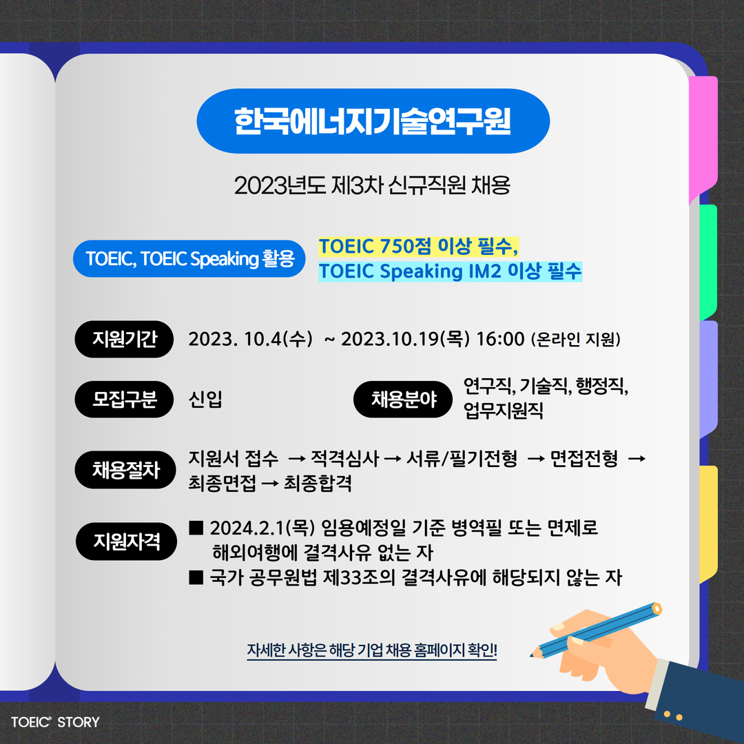 | 한국에너지기술연구원 | 신입 | 2023년도 제3차 신규직원 채용 | 10.19(목) 16:00 | TOEIC 750점 이상 필수, TOEIC Speaking IM2 이상 필수 |