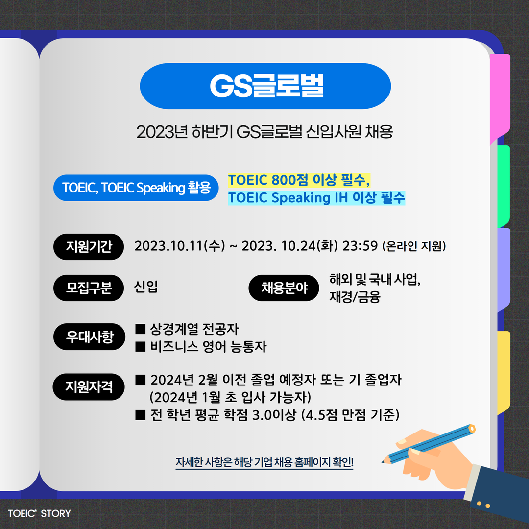 | GS글로벌 | 신입 | 2023년 하반기 GS글로벌 신입사원 채용 | 10.24(화) 23:59 | TOEIC 800점 이상 필수, TOEIC Speaking IH 이상 필수 |