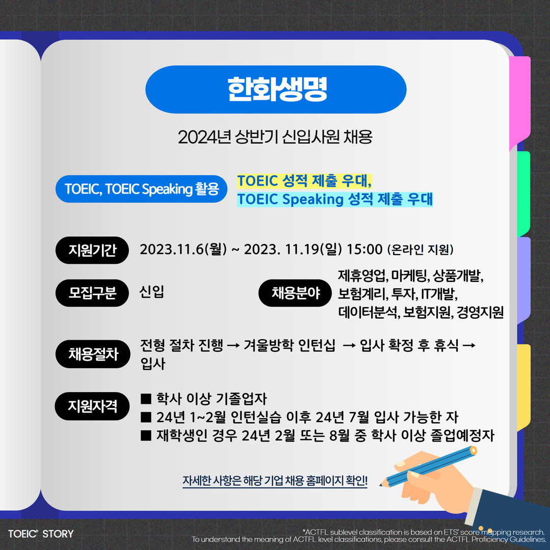 | 한화생명 | 신입 | 2024년 상반기 신입사원 채용 | 11.19(일) 15:00 | TOEIC 성적 제출 우대, TOEIC Speaking 성적 제출 우대 |